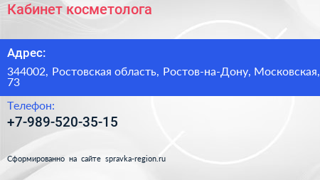 Кабинет косметолога по адресу 344002, Ростовская область, Ростов-на-Дону, Московская, 73 в дальнейшем Организация, размещена в следующих категориях:
