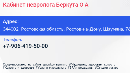Кабинет невролога Беркута О.А. по адресу 344002, Ростовская область, Ростов-на-Дону, Шаумяна, 76 в дальнейшем Организация, размещена в следующих категориях: