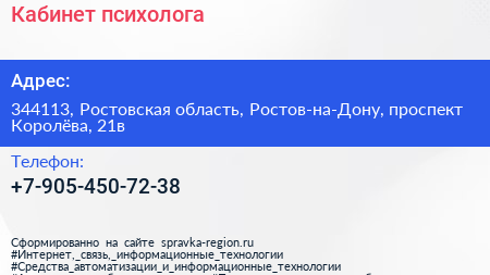 Кабинет психолога по адресу 344113, Ростовская область, Ростов-на-Дону, проспект Королёва, 21в в дальнейшем Организация, размещена в следующих категориях: