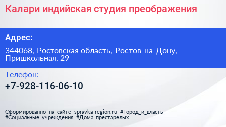 Калари, индийская студия преображения по адресу 344068, Ростовская область, Ростов-на-Дону, Пришкольная, 29 в дальнейшем Организация, размещена в следующих категориях: