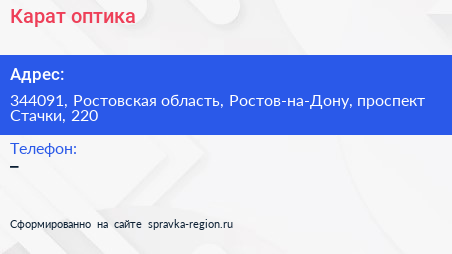 Карат, оптика по адресу 344091, Ростовская область, Ростов-на-Дону, проспект Стачки, 220 в дальнейшем Организация, размещена в следующих категориях: