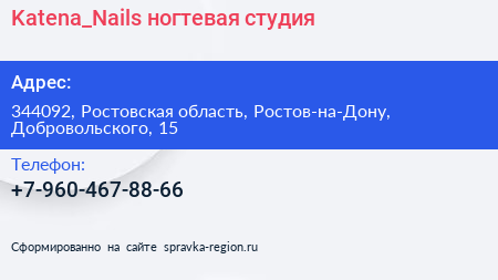 Katena_Nails, ногтевая студия по адресу 344092, Ростовская область, Ростов-на-Дону, Добровольского, 15 в дальнейшем Организация, размещена в следующих категориях: