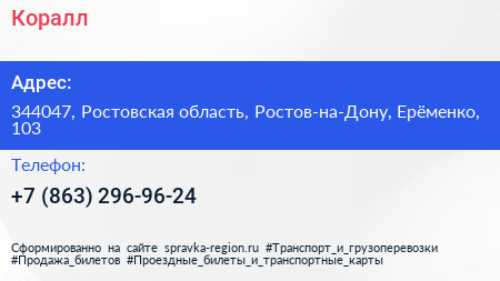 Коралл по адресу 344047, Ростовская область, Ростов-на-Дону, Ерёменко, 103 в дальнейшем Организация, размещена в следующих категориях: