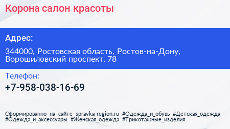 Корона, салон красоты по адресу 344000, Ростовская область, Ростов-на-Дону, Ворошиловский проспект, 78 в дальнейшем Организация, размещена в следующих категориях: