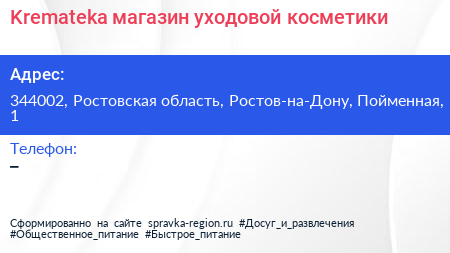 Kremateka, магазин уходовой косметики по адресу 344002, Ростовская область, Ростов-на-Дону, Пойменная, 1 в дальнейшем Организация, размещена в следующих категориях: