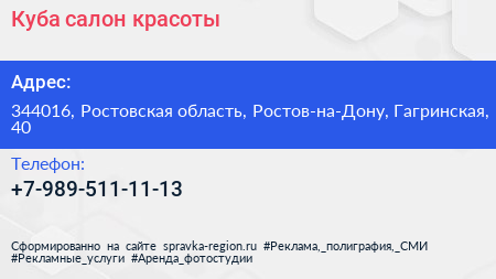 Куба, салон красоты по адресу 344016, Ростовская область, Ростов-на-Дону, Гагринская, 40 в дальнейшем Организация, размещена в следующих категориях: