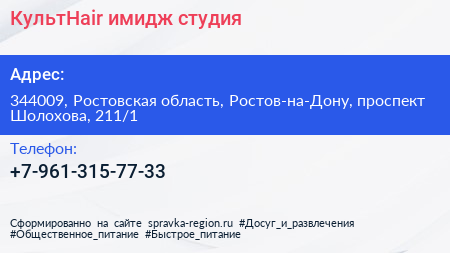КультHair, имидж-студия по адресу 344009, Ростовская область, Ростов-на-Дону, проспект Шолохова, 211/1 в дальнейшем Организация, размещена в следующих категориях: