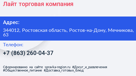 Лайт, торговая компания по адресу 344012, Ростовская область, Ростов-на-Дону, Мечникова, 63 в дальнейшем Организация, размещена в следующих категориях: