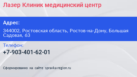 Лазер Клиник, медицинский центр по адресу 344002, Ростовская область, Ростов-на-Дону, Большая Садовая, 63 в дальнейшем Организация, размещена в следующих категориях: