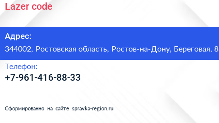Lazer code по адресу 344002, Ростовская область, Ростов-на-Дону, Береговая, 8 в дальнейшем Организация, размещена в следующих категориях: