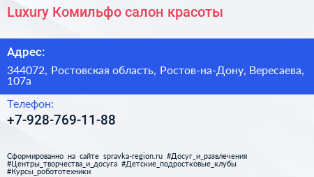 Luxury Комильфо, салон красоты по адресу 344072, Ростовская область, Ростов-на-Дону, Вересаева, 107а в дальнейшем Организация, размещена в следующих категориях: