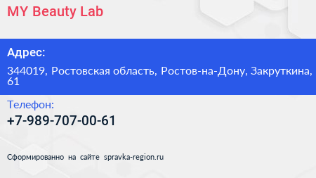 MY Beauty Lab по адресу 344019, Ростовская область, Ростов-на-Дону, Закруткина, 61 в дальнейшем Организация, размещена в следующих категориях: