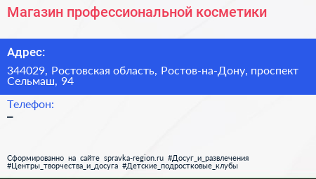 Магазин профессиональной косметики по адресу 344029, Ростовская область, Ростов-на-Дону, проспект Сельмаш, 94 в дальнейшем Организация, размещена в следующих категориях: