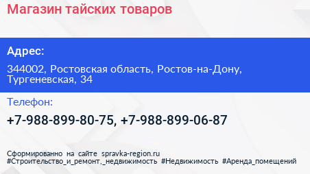 Магазин тайских товаров по адресу 344002, Ростовская область, Ростов-на-Дону, Тургеневская, 34 в дальнейшем Организация, размещена в следующих категориях: