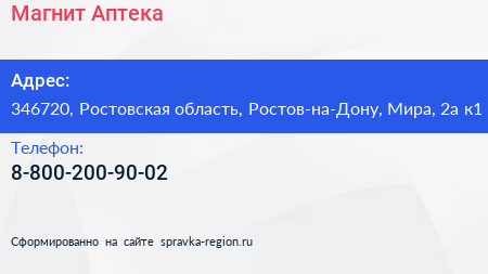 Магнит-Аптека по адресу 346720, Ростовская область, Ростов-на-Дону, Мира, 2а к1 в дальнейшем Организация, размещена в следующих категориях:
