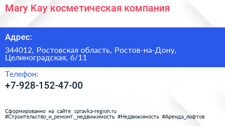 Mary Kay, косметическая компания по адресу 344012, Ростовская область, Ростов-на-Дону, Целиноградская, 6/11 в дальнейшем Организация, размещена в следующих категориях: