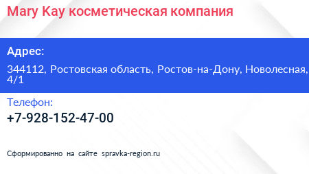 Mary Kay, косметическая компания по адресу 344112, Ростовская область, Ростов-на-Дону, Новолесная, 4/1 в дальнейшем Организация, размещена в следующих категориях: