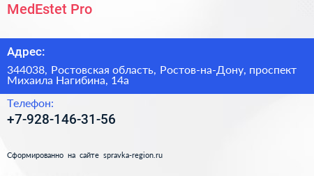 MedEstet-Pro по адресу 344038, Ростовская область, Ростов-на-Дону, проспект Михаила Нагибина, 14а в дальнейшем Организация, размещена в следующих категориях: