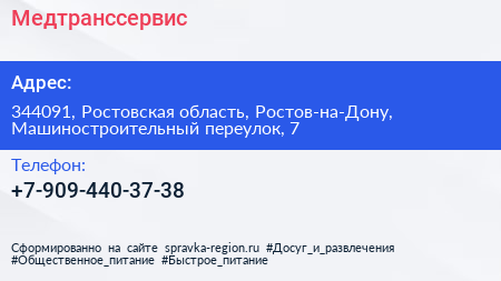 Медтранссервис по адресу 344091, Ростовская область, Ростов-на-Дону, Машиностроительный переулок, 7 в дальнейшем Организация, размещена в следующих категориях: