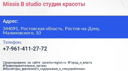 Missis B studio, студия красоты по адресу 344091, Ростовская область, Ростов-на-Дону, Малиновского, 10 в дальнейшем Организация, размещена в следующих категориях: