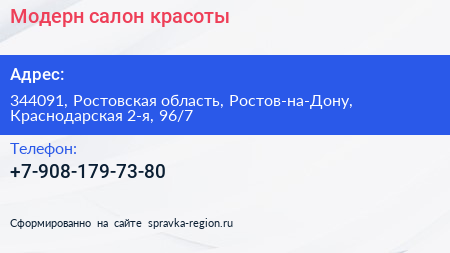 Модерн, салон красоты по адресу 344091, Ростовская область, Ростов-на-Дону, Краснодарская 2-я, 96/7 в дальнейшем Организация, размещена в следующих категориях: