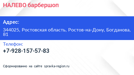 НАЛЕВО, барбершоп по адресу 344025, Ростовская область, Ростов-на-Дону, Богданова, 81 в дальнейшем Организация, размещена в следующих категориях: