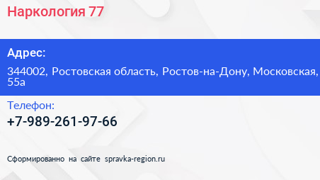 Наркология-77 по адресу 344002, Ростовская область, Ростов-на-Дону, Московская, 55а в дальнейшем Организация, размещена в следующих категориях: