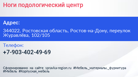 Ноги, подологический центр по адресу 344022, Ростовская область, Ростов-на-Дону, переулок Журавлёва, 102/105 в дальнейшем Организация, размещена в следующих категориях: