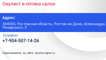 Окулист и оптика, салон по адресу 344010, Ростовская область, Ростов-на-Дону, Александра Печерского, 3 в дальнейшем Организация, размещена в следующих категориях: