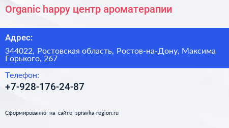 Organic & happy, центр ароматерапии по адресу 344022, Ростовская область, Ростов-на-Дону, Максима Горького, 267 в дальнейшем Организация, размещена в следующих категориях: