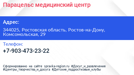 Парацельс, медицинский центр по адресу 344025, Ростовская область, Ростов-на-Дону, Комсомольская, 29 в дальнейшем Организация, размещена в следующих категориях: