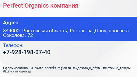 Perfect Organics, компания по адресу 344000, Ростовская область, Ростов-на-Дону, проспект Соколова, 72 в дальнейшем Организация, размещена в следующих категориях: