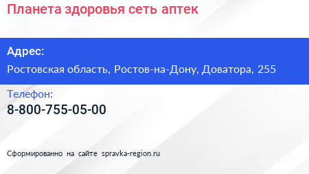 Планета здоровья, сеть аптек по адресу Ростовская область, Ростов-на-Дону, Доватора, 255 в дальнейшем Организация, размещена в следующих категориях: