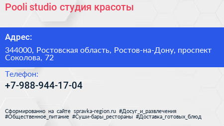 Pooli studio, студия красоты по адресу 344000, Ростовская область, Ростов-на-Дону, проспект Соколова, 72 в дальнейшем Организация, размещена в следующих категориях: