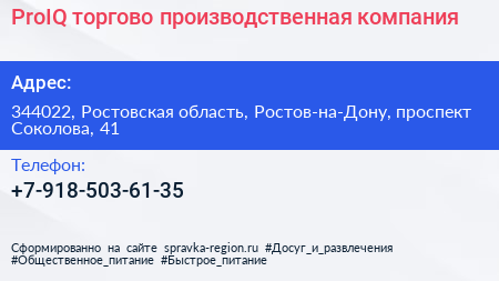 ProIQ, торгово-производственная компания по адресу 344022, Ростовская область, Ростов-на-Дону, проспект Соколова, 41 в дальнейшем Организация, размещена в следующих категориях: