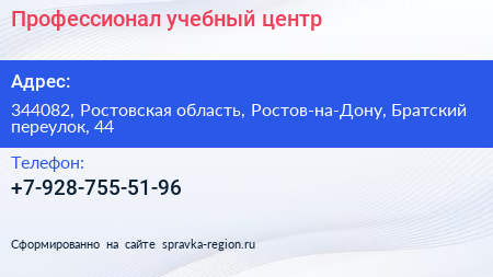 Профессионал, учебный центр по адресу 344082, Ростовская область, Ростов-на-Дону, Братский переулок, 44 в дальнейшем Организация, размещена в следующих категориях: