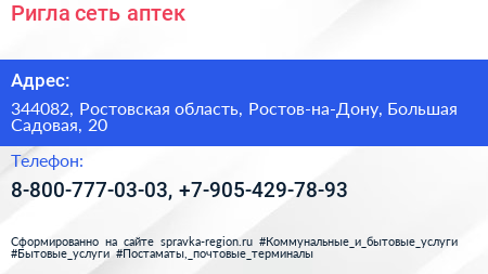 Ригла, сеть аптек по адресу 344082, Ростовская область, Ростов-на-Дону, Большая Садовая, 20 в дальнейшем Организация, размещена в следующих категориях: