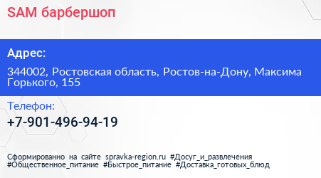 SAM, барбершоп по адресу 344002, Ростовская область, Ростов-на-Дону, Максима Горького, 155 в дальнейшем Организация, размещена в следующих категориях: