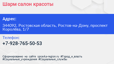 Шарм, салон красоты по адресу 344092, Ростовская область, Ростов-на-Дону, проспект Королёва, 1/7 в дальнейшем Организация, размещена в следующих категориях: