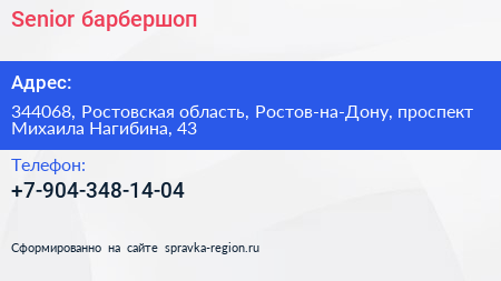 Senior, барбершоп по адресу 344068, Ростовская область, Ростов-на-Дону, проспект Михаила Нагибина, 43 в дальнейшем Организация, размещена в следующих категориях: