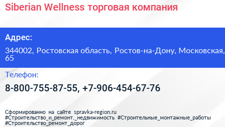Siberian Wellness, торговая компания по адресу 344002, Ростовская область, Ростов-на-Дону, Московская, 65 в дальнейшем Организация, размещена в следующих категориях: