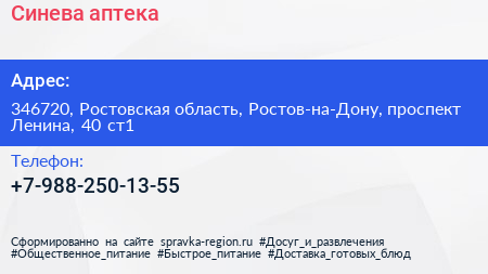 Синева, аптека по адресу 346720, Ростовская область, Ростов-на-Дону, проспект Ленина, 40 ст1 в дальнейшем Организация, размещена в следующих категориях: