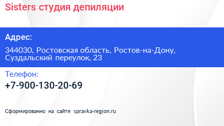 Sisters, студия депиляции по адресу 344030, Ростовская область, Ростов-на-Дону, Суздальский переулок, 23 в дальнейшем Организация, размещена в следующих категориях: