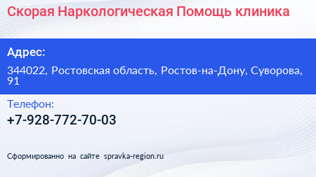 Скорая Наркологическая Помощь, клиника по адресу 344022, Ростовская область, Ростов-на-Дону, Суворова, 91 в дальнейшем Организация, размещена в следующих категориях: