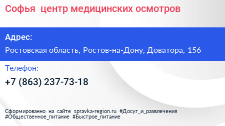 Софья+, центр медицинских осмотров по адресу Ростовская область, Ростов-на-Дону, Доватора, 156 в дальнейшем Организация, размещена в следующих категориях: