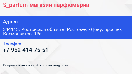 S_parfum, магазин парфюмерии по адресу 344113, Ростовская область, Ростов-на-Дону, проспект Космонавтов, 19а в дальнейшем Организация, размещена в следующих категориях: