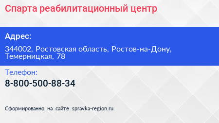 Спарта, реабилитационный центр по адресу 344002, Ростовская область, Ростов-на-Дону, Темерницкая, 78 в дальнейшем Организация, размещена в следующих категориях: