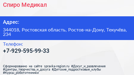 Спиро Медикал по адресу 344018, Ростовская область, Ростов-на-Дону, Текучёва, 234 в дальнейшем Организация, размещена в следующих категориях: