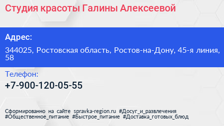 Студия красоты Галины Алексеевой по адресу 344025, Ростовская область, Ростов-на-Дону, 45-я линия, 58 в дальнейшем Организация, размещена в следующих категориях: