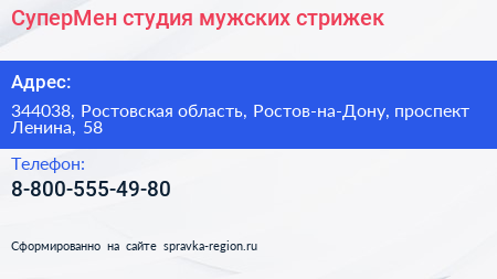 СуперМен, студия мужских стрижек по адресу 344038, Ростовская область, Ростов-на-Дону, проспект Ленина, 58 в дальнейшем Организация, размещена в следующих категориях: